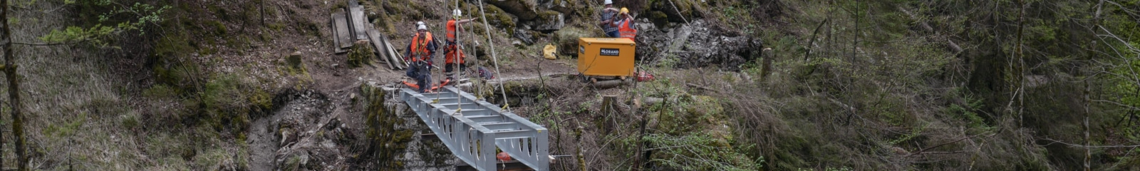 La nouvelle passerelle, fabriquée par Morand Constructions Métalliques, a été héliportée dans les gorges de la Jogne. L’hélicoptère de la société Rotex Helicopter n’est pas passé inaperçu à Broc ce vendredi 24 avril 2020. La machine avait pour mission de transporter les éléments de la nouvelle passerelle qui permet aux promeneurs de cheminer le long des célèbres gorges de la Jogne qui relient la cité chocolatière au barrage de Montsalvens et à son lac.